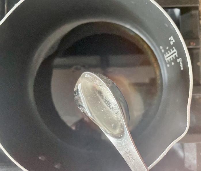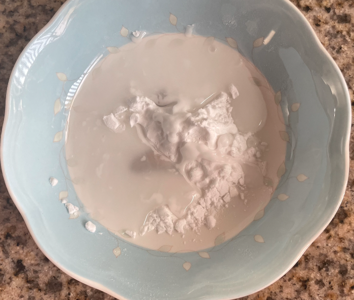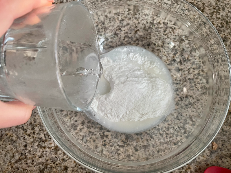 소스가 데워질 동안 전분가루와 물을 따로 섞어주세요. (참고: 굳지 않게 빨리 섞어주세요)