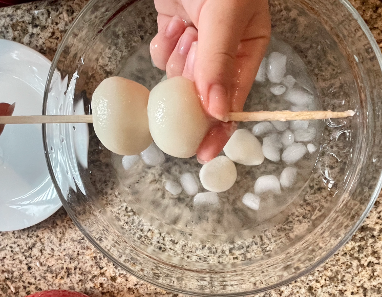 삶은 당고를 얼음물에 담가서 식혀줍니다.