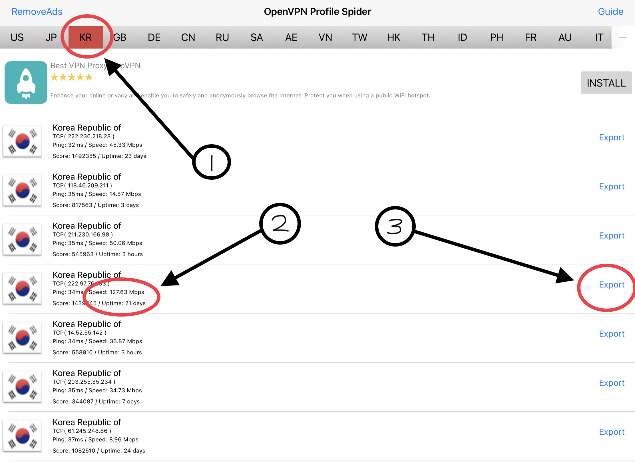 1) After installation, go to “OvpnSpider” (Best VPN Proxy OvpnSpider) and click on KR (Korea).