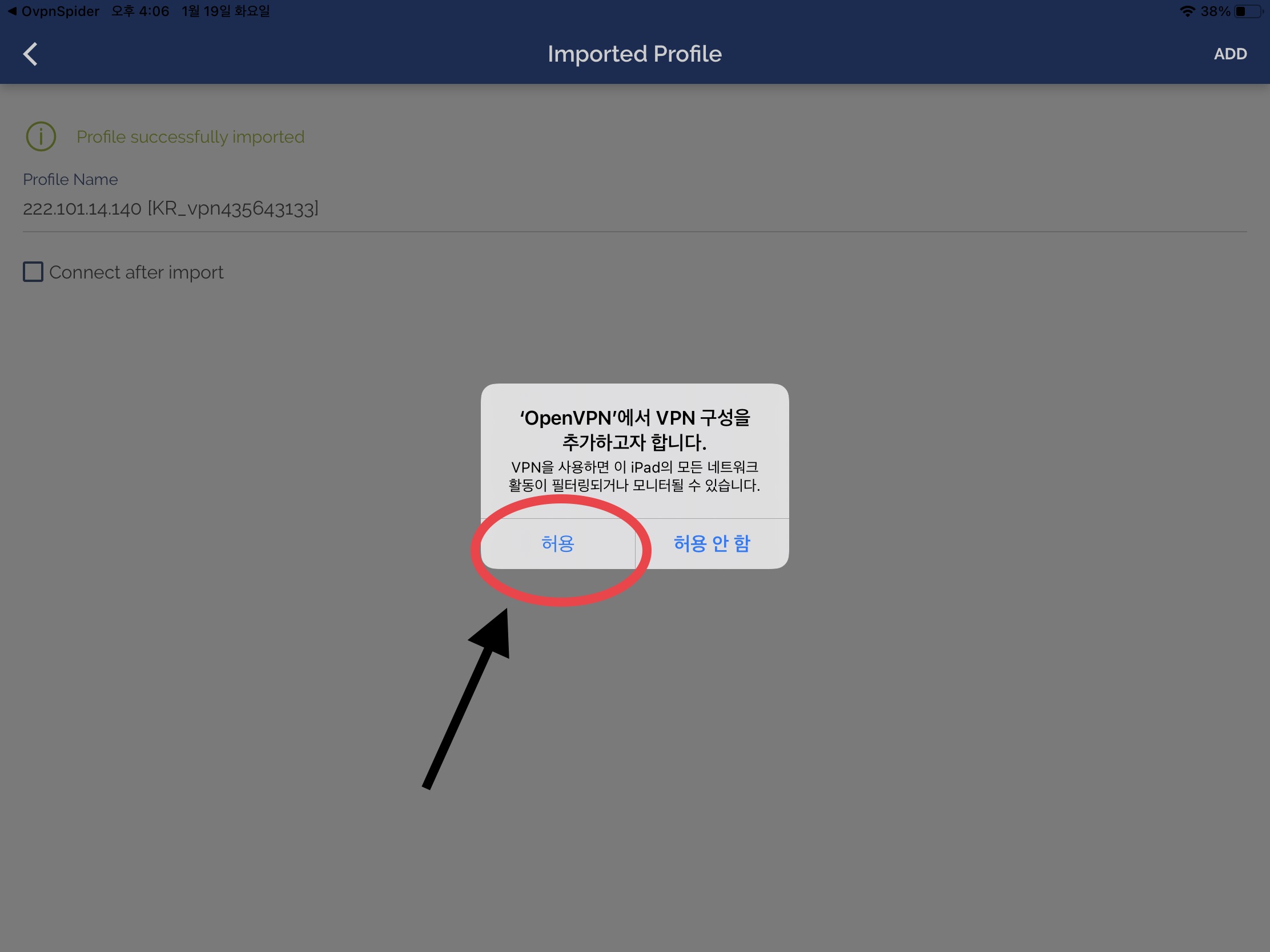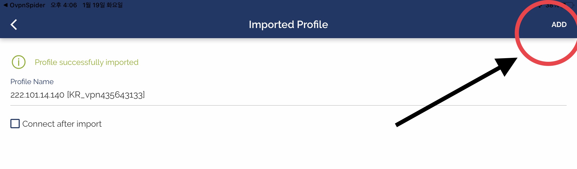 OpenVPN profile이 뜨면 주황색으로 있는 ADD (추가)를 누르세요.