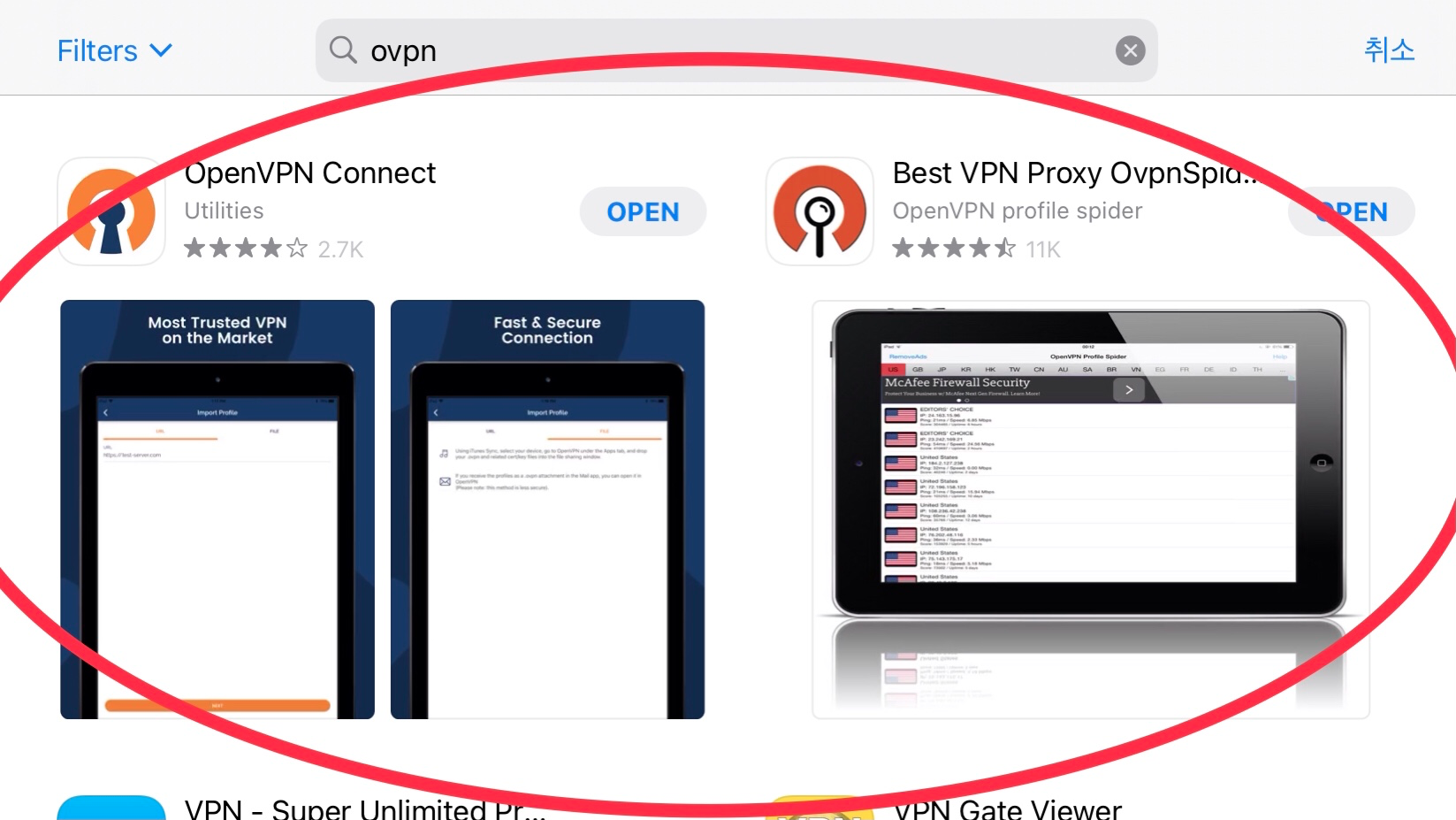 앱스토에서 OPENVPN이라고 치고 "OpenVPN Connect"과 "Best VPN Proxy OvpnSpider" 이 뜨면 그 두 앱을 설치해 주세요.
