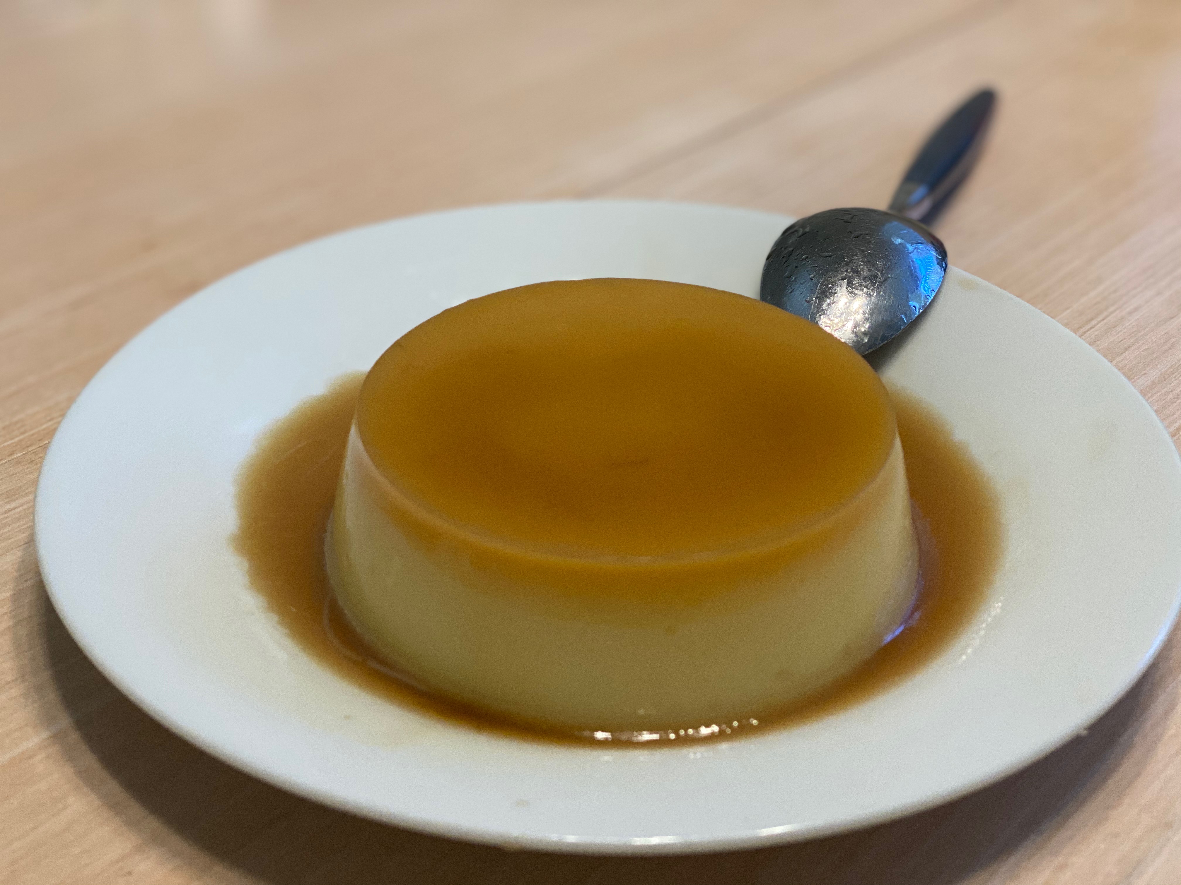 (7) 시간이 다 됐으면 냉장고에서 꺼내 주세요. 접시를 푸딩 컨테이너 위에 누고 거꾸로 돌려서 윗부분을 살짝 쳐주세요. 그럼 푸딩이 빠져 나올 것입니다.