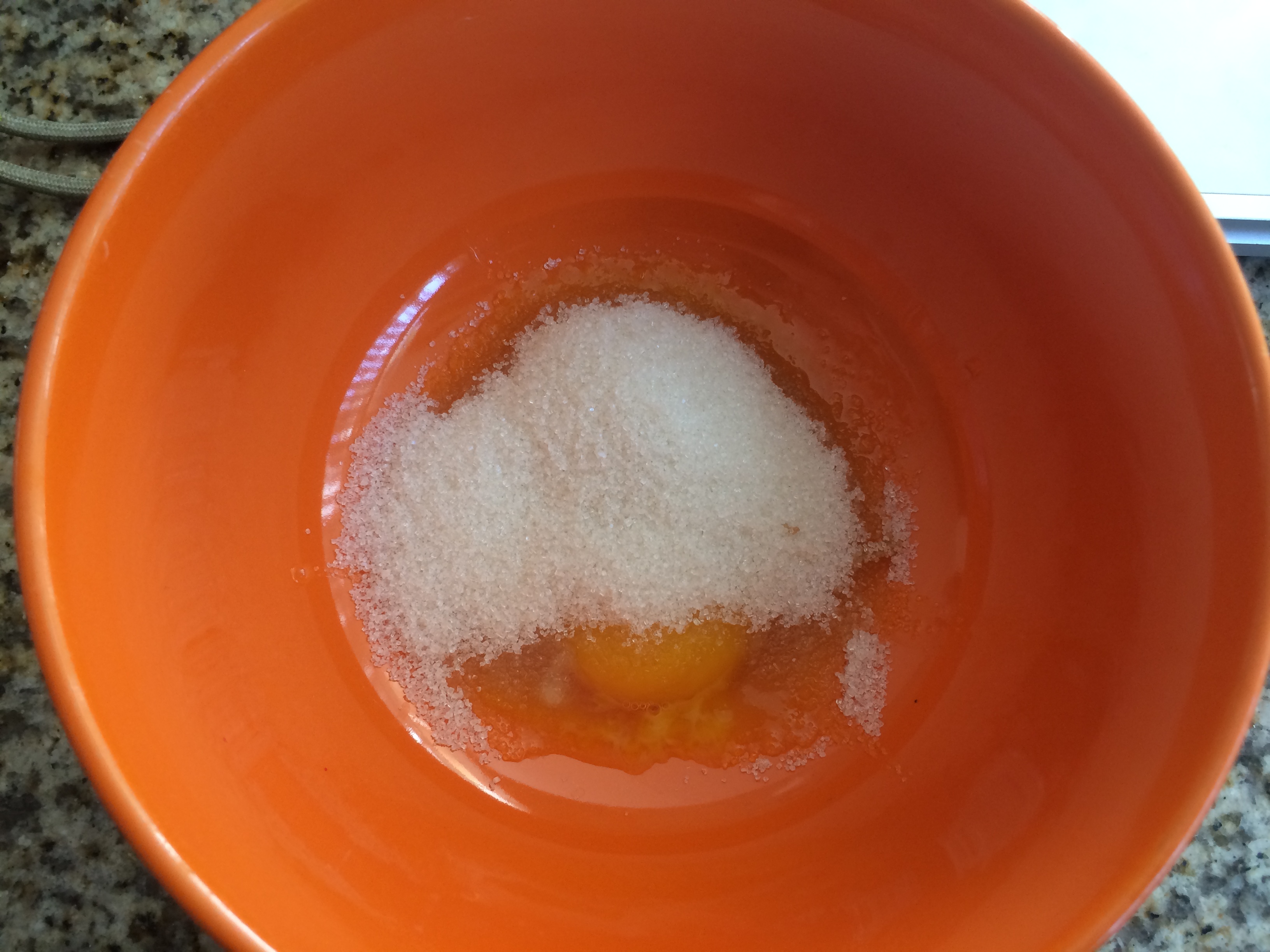 (3) 카라멜은 다 완성됐고, 이제 계란 노른자와 설탕을 다른 볼 그릇에서 섞어주세요. 우유를 전자레인지에 1~2 분을 데우고 믹스에 부어주세요.