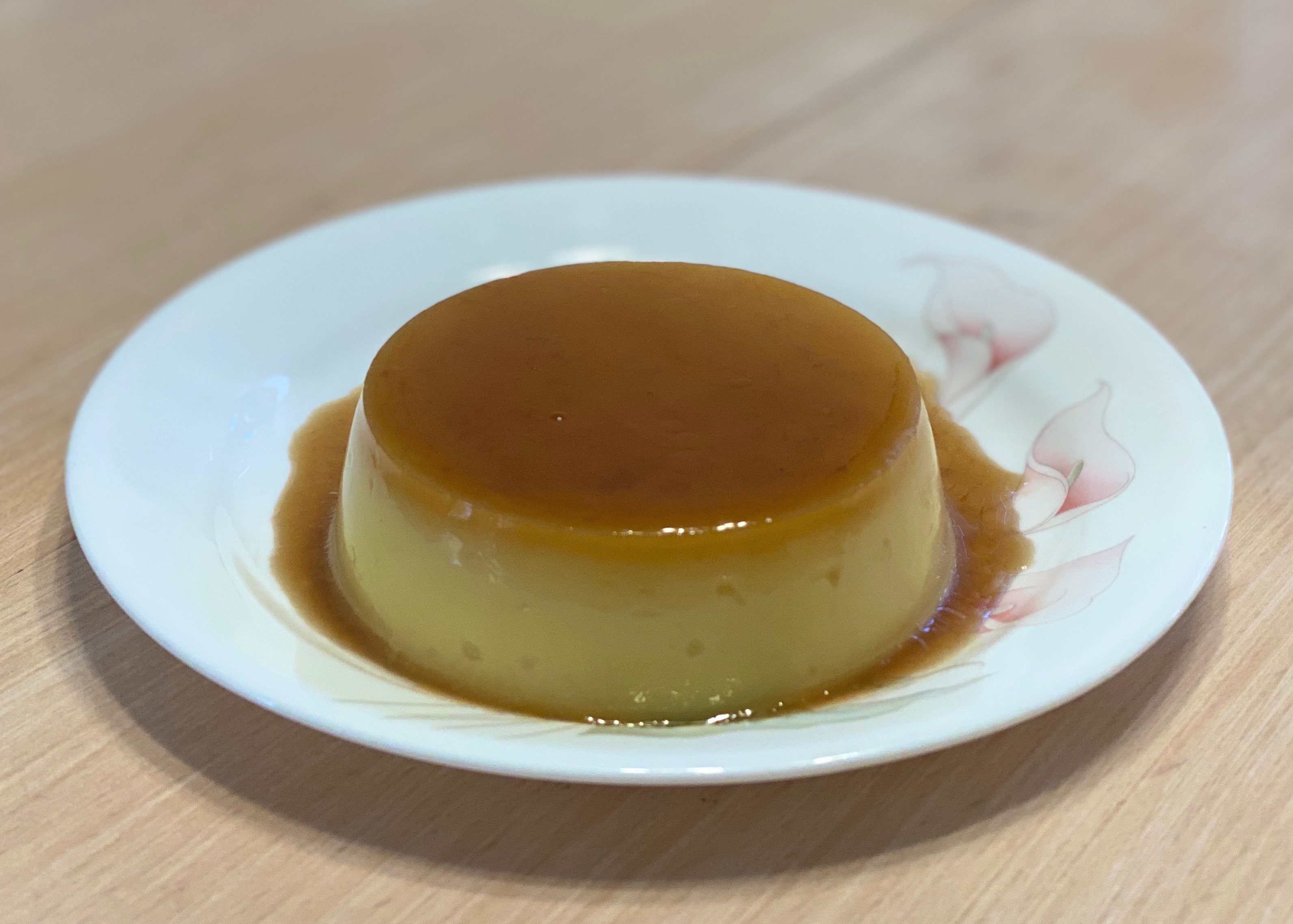 When it's all ready, take the pudding out from the fridge and remove the wrap. Get a plate and place it on top of the container, then flip it upside down. The pudding will come out, and it will be ready for you to enjoy~