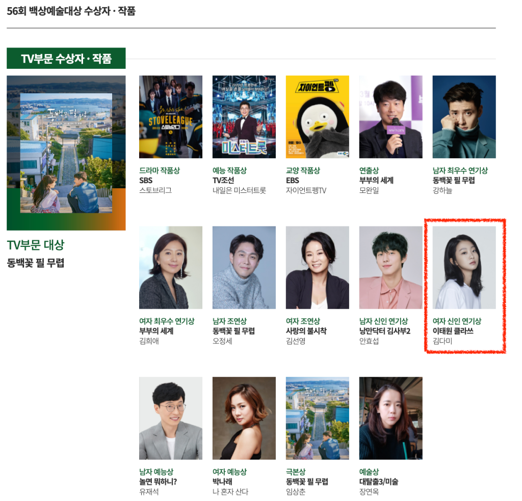 2020년 제56회 백상예술대상의 TV부분 여자 조연상에 이태원 클라쓰로 후보에 올랐습니다.