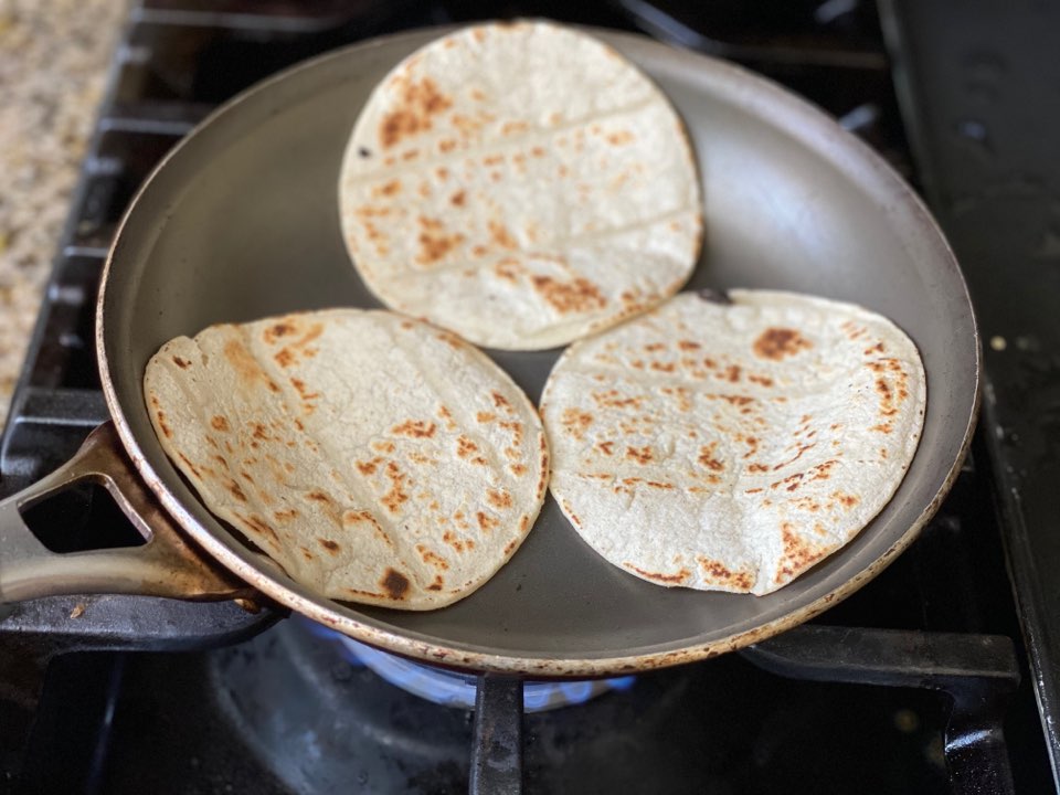 Either heat the soft taco on top of the gas and shape it or, heat it on a frying pan.