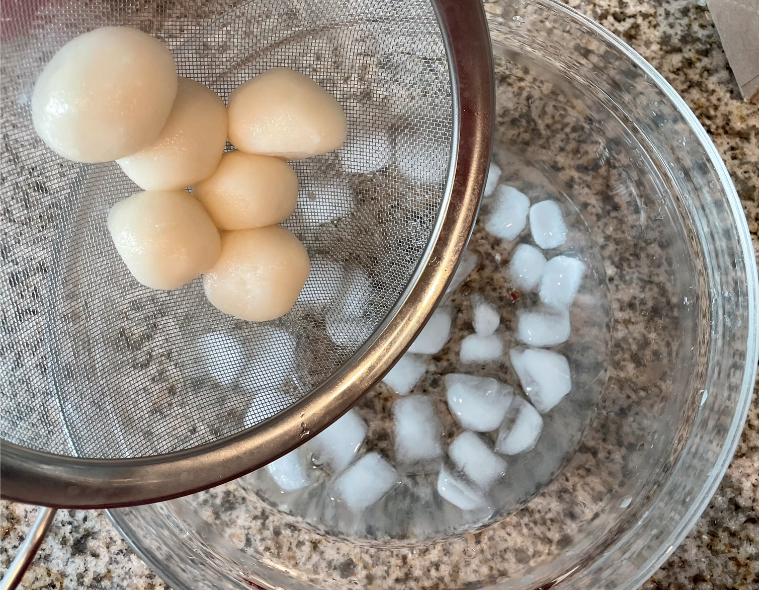 삶은 당고를 얼음물에 담가서 식혀줍니다.
