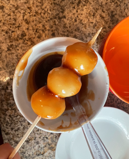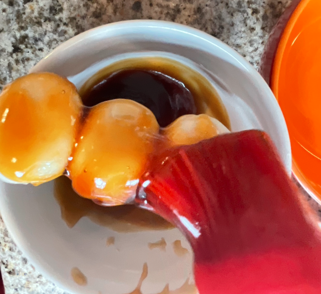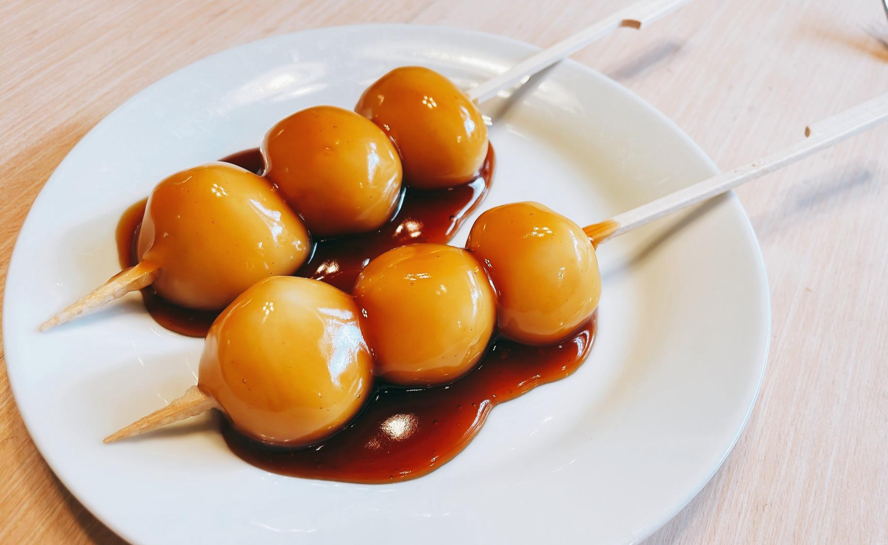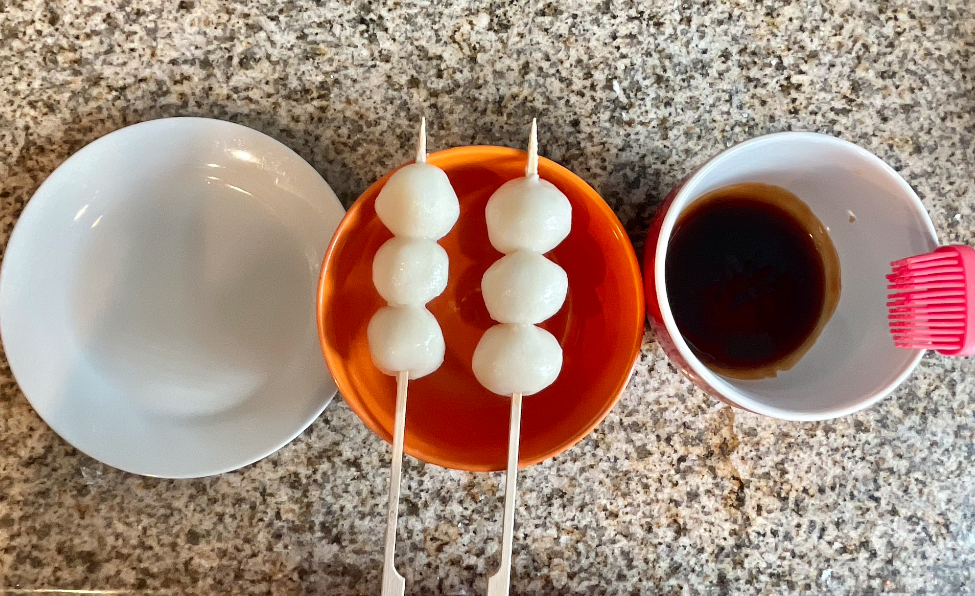 Pour the sweet soy glaze on top of the Mitarashi Dango.