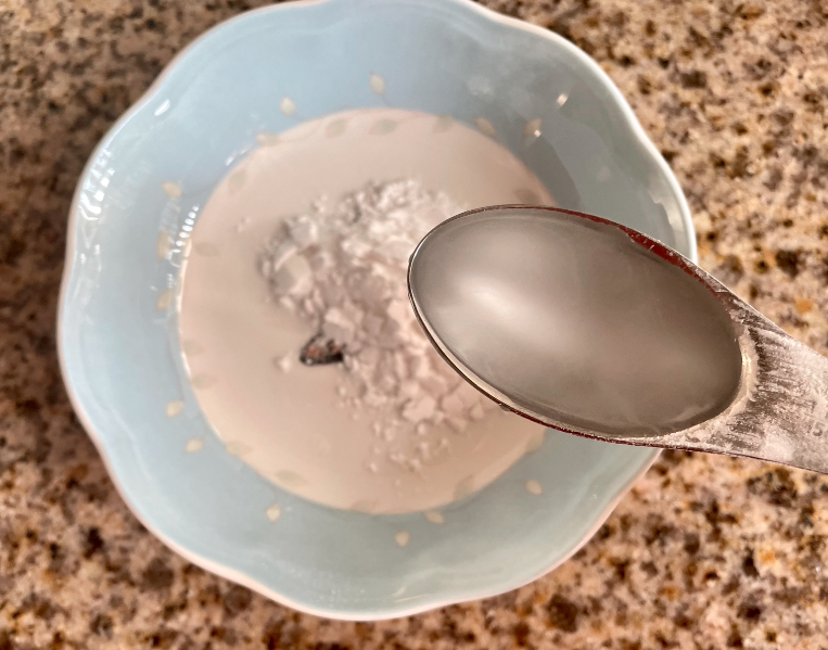 소스가 데워질 동안 전분가루와 물을 따로 섞어주세요. (참고: 굳지 않게 빨리 섞어주세요)
