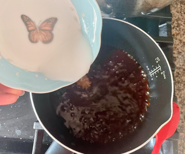 전분가루와 물을 섞은 후, 끓고 있는 소스 안에 조금씩 부어줍니다.