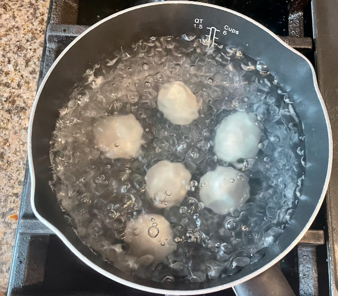 Transfer the dumplings to the bowl of iced water to cool.