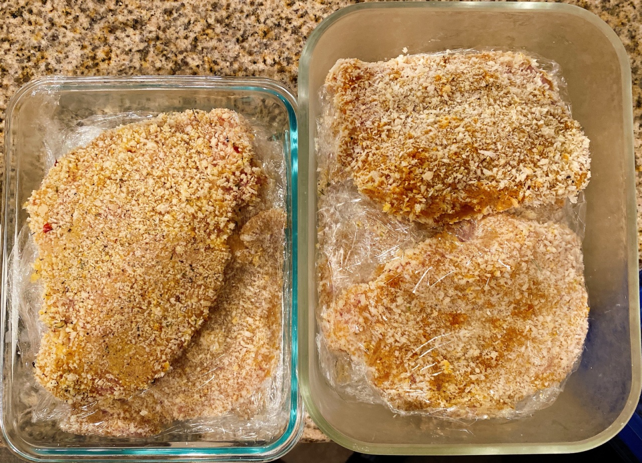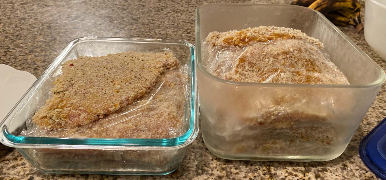 튀김옷을 입히고, 돈가스를 보관 시, 돈가스 사이사이에 겹쳐지지 않도록, 비닐이나, 랩으로 구분을 지워준다.