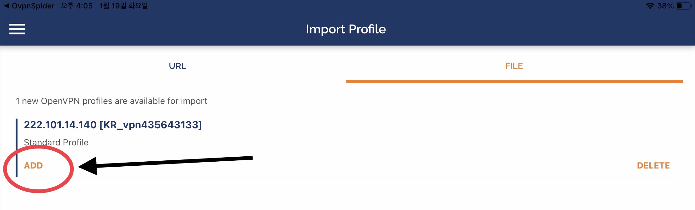 OpenVPN profile이 뜨면 주황색으로 있는 ADD (추가)를 누르세요.