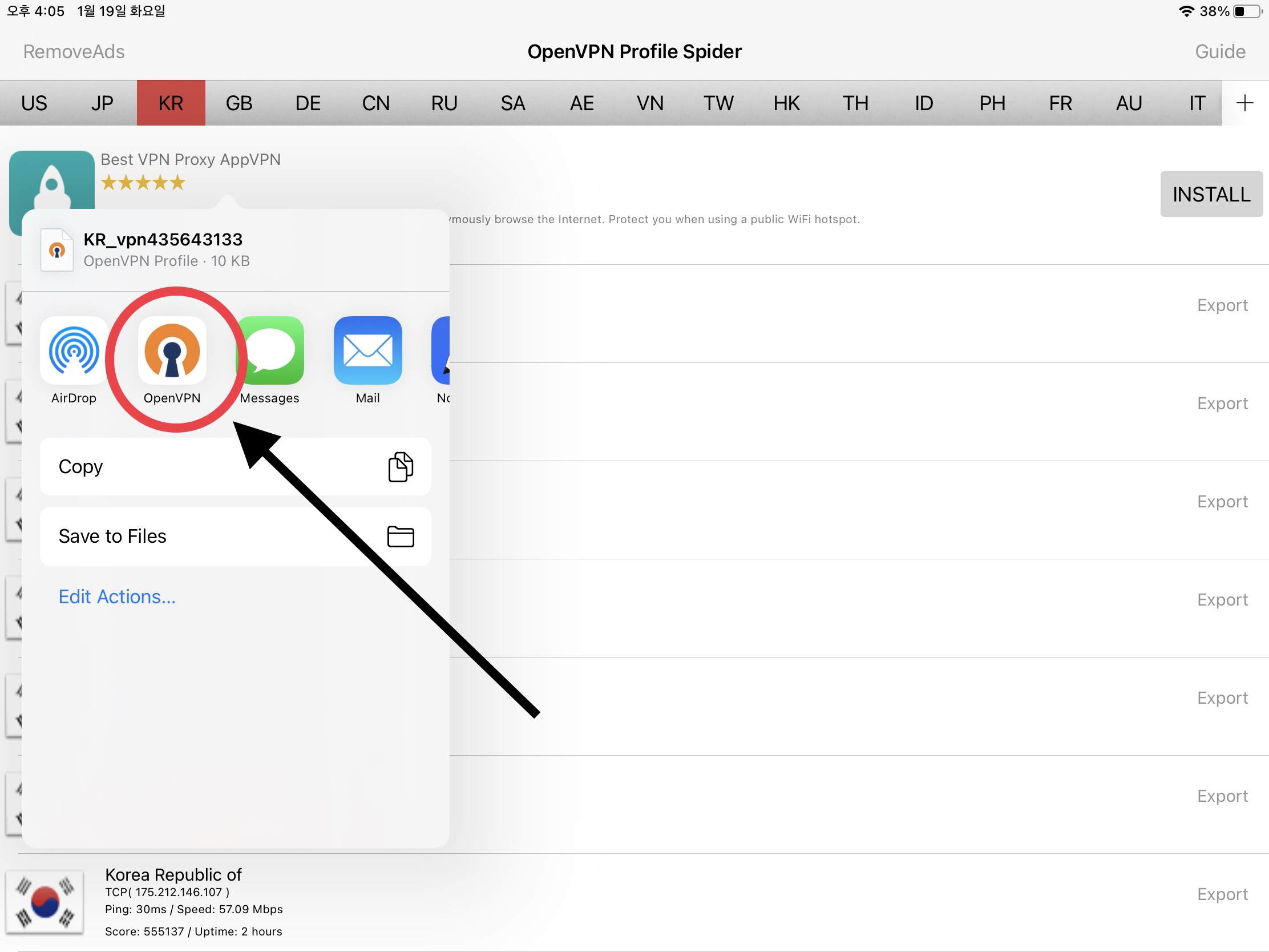1) After installation, go to “OvpnSpider” (Best VPN Proxy OvpnSpider) and click on KR (Korea).