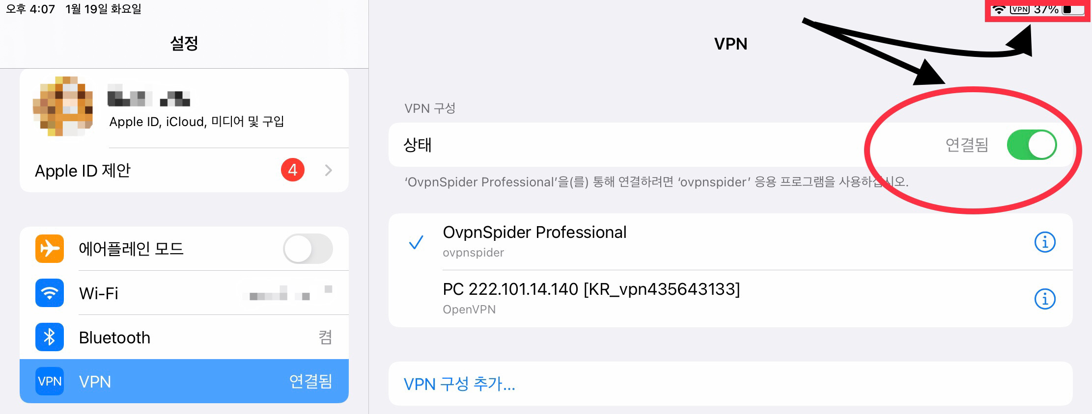 VPN항목에 ‘연결됨’ 이라고 나오면 연결이 된 겁니다.