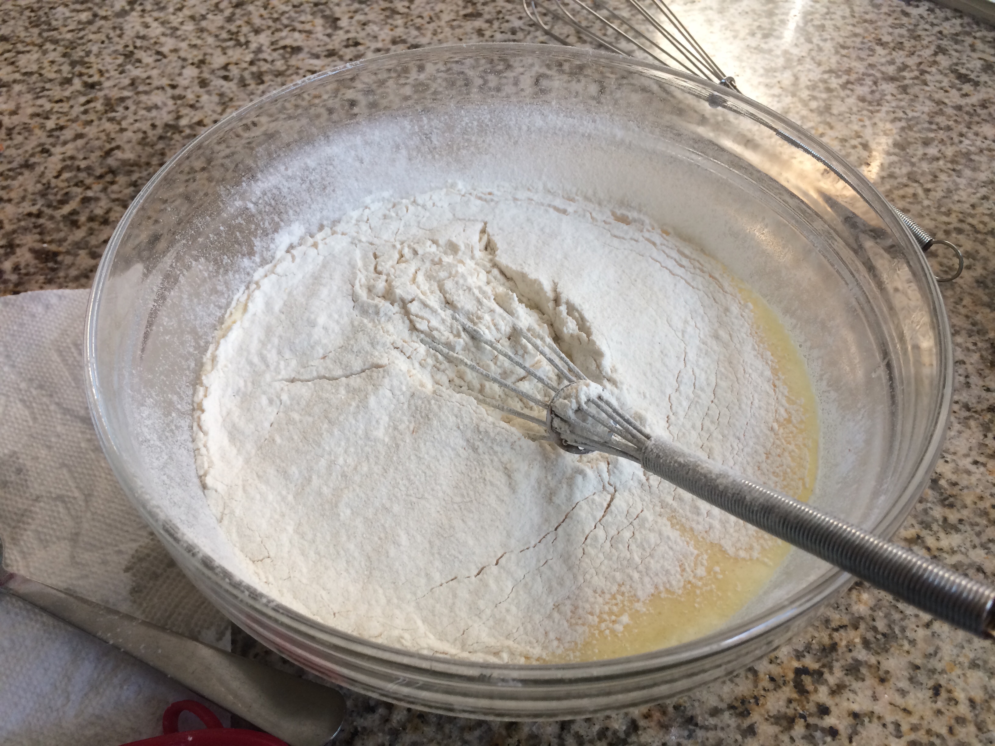 (3) 박력분을 붓고 뭉친 게 많이 없어질 때까지 잘 섞어준다.