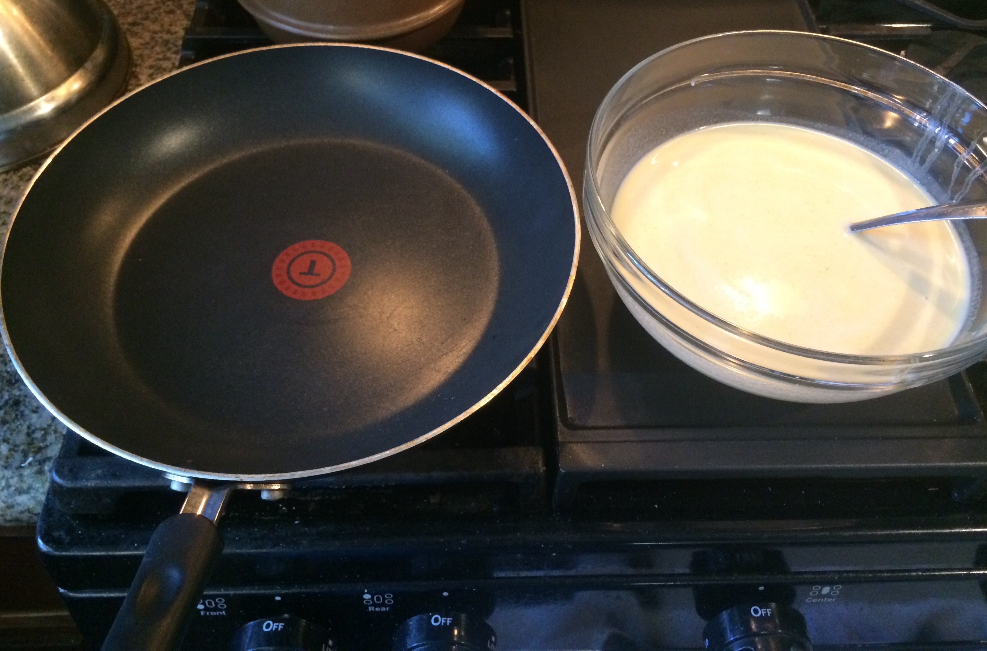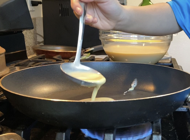 (6) 반죽을 1/4식 국자로 떠서 프라이팬에 중앙에 붓는다. 얇게 만들기 위해서 프라이팬의 손잡이를 잡고 올려서 골고루 돌려서 펼친다.