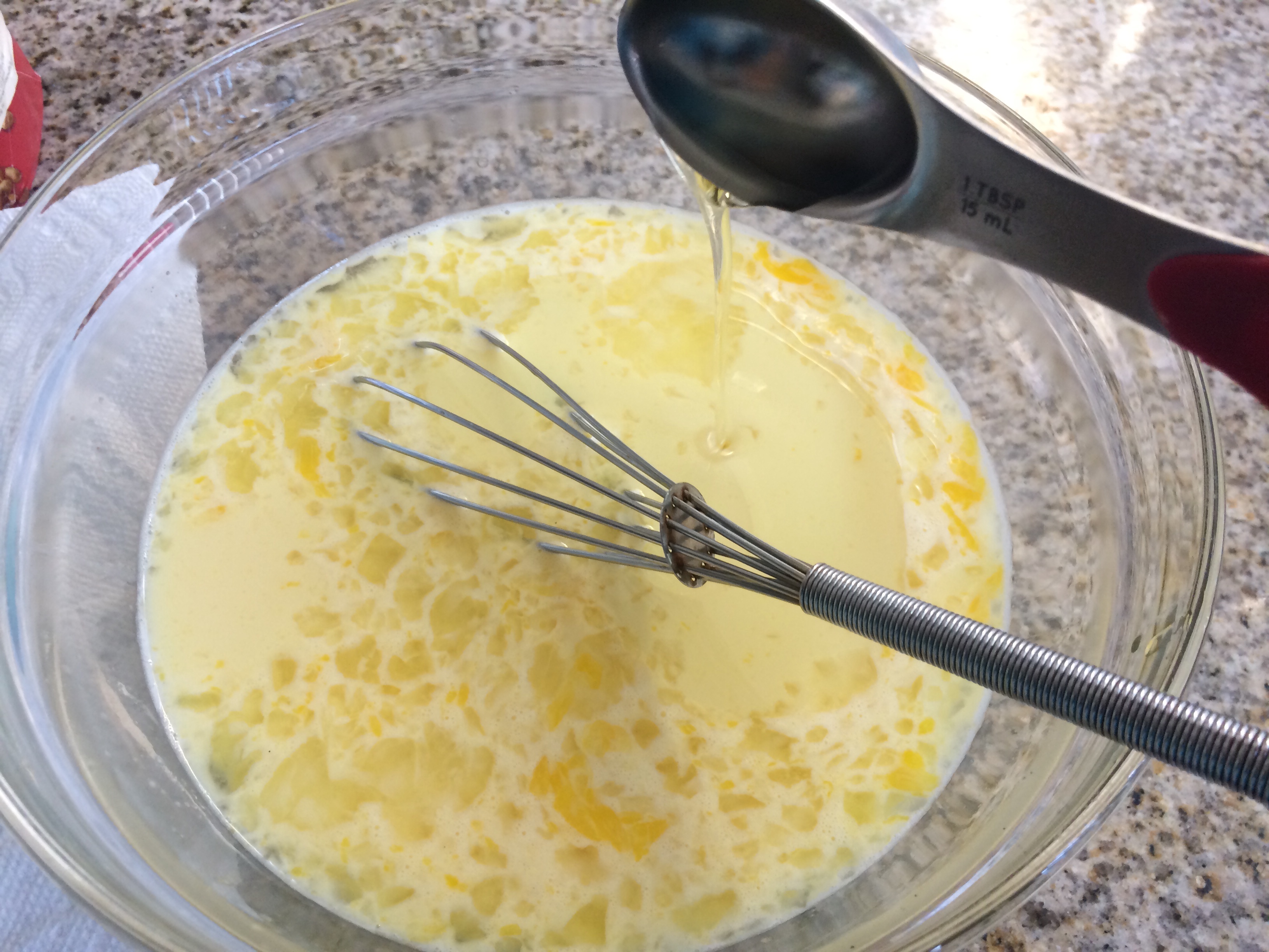(2) 우유를 섞어가면서 조금씩 붓는다. 잘 섞은 다음, 식용유/버터를 넣고 또 섞는다.