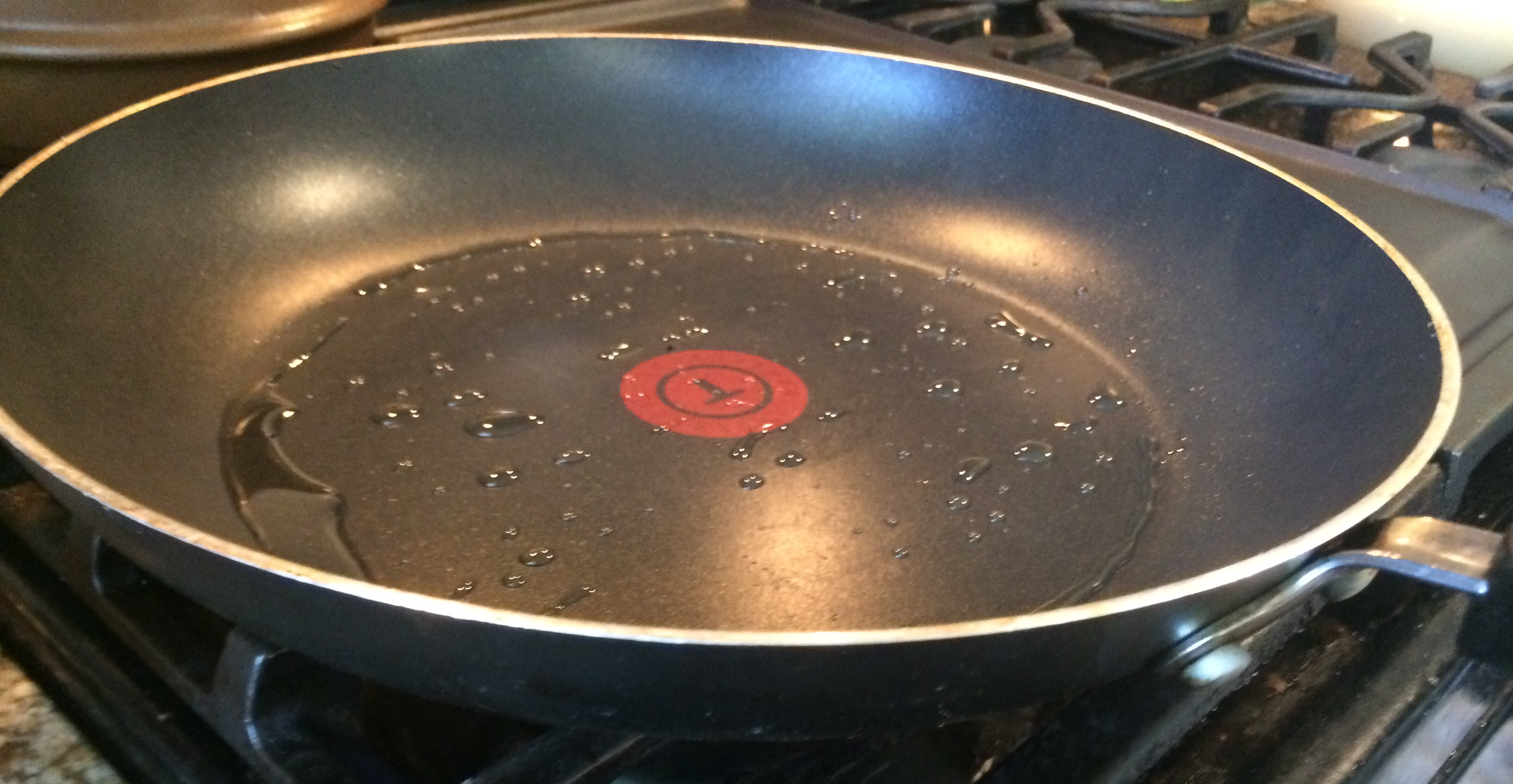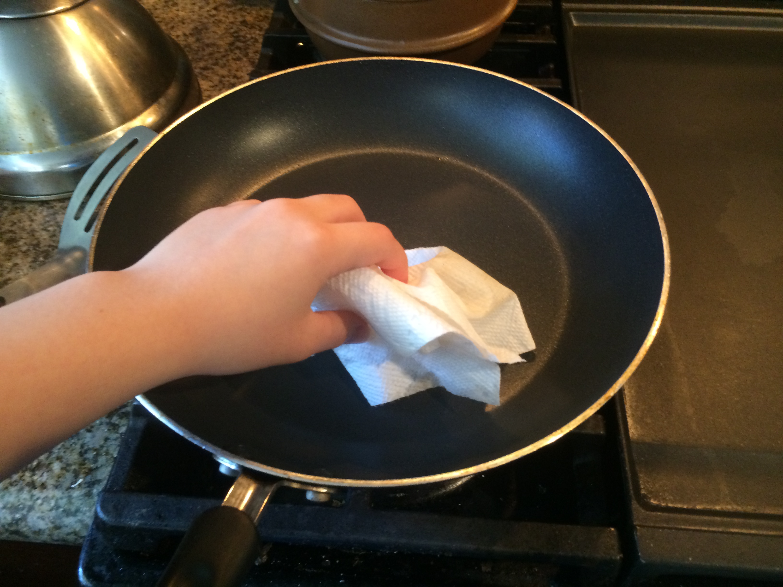 (5) 프라이팬을 가스레인지 위에 올리고. 기름을 붓고 데운 다음, 키친 페이퍼로 골고루 핀다.