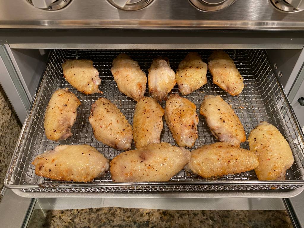 The wings can be grilled again after glazing with the seasoned hot sauce.